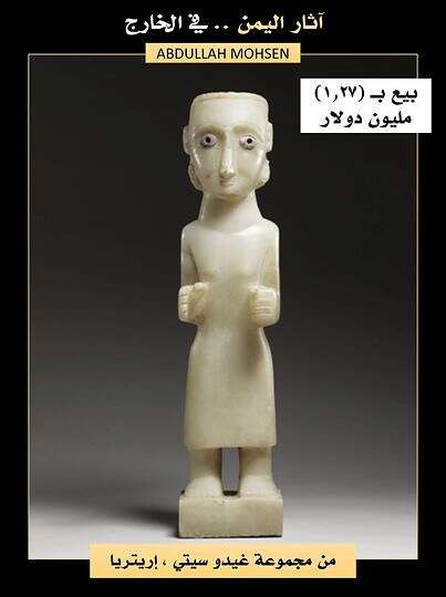وأوضح محسن - في منشور بصفحته على فيسبوك - أن تمثال لامرأة من قتبان، اليمن (ارتفاع 60 سنتيمتراً)، بيع في دار سوذبي للمزادات، نيويورك في 5 ديسمبر 2007م بمبلغ وقدره مليون ومئتان وسبعون ألف دولارا أمريكي.